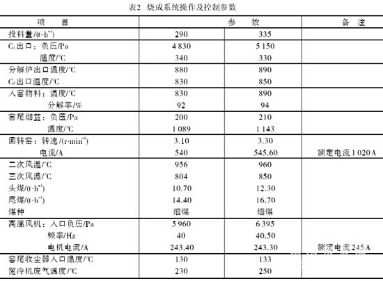 項(xiàng)目投產(chǎn)后,燒成系統(tǒng)的主要操作及控制參數(shù)見表2。