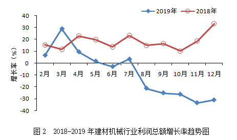2019年,建材機(jī)械行業(yè)累計(jì)實(shí)現(xiàn)利潤(rùn)總額36.57億元,同比下降31.00%,增速較上年同期回落64.26個(gè)百分點(diǎn),落后于建材工業(yè)(15.6%)、機(jī)械工業(yè)(-4.53%)的增速,遠(yuǎn)低于建材機(jī)械相關(guān)領(lǐng)域工程機(jī)械(16.48%)、重型礦山機(jī)械(21.65%)增速。從增速變化趨勢(shì)看(見(jiàn)圖2),全年利潤(rùn)總額增速下行態(tài)勢(shì)明顯,且與上年相比回落較大,降幅最高達(dá)64.26個(gè)百分點(diǎn)。