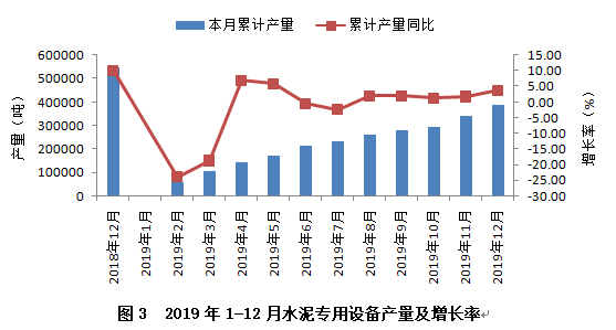從行業(yè)重點(diǎn)監(jiān)測(cè)的產(chǎn)品看,水泥專(zhuān)用設(shè)備產(chǎn)量實(shí)現(xiàn)小幅增長(zhǎng),2019年累計(jì)完成38.65萬(wàn)噸,同比增長(zhǎng)3.69%,較上年同期下降6.37個(gè)百分點(diǎn)。從全年產(chǎn)量增速變化趨勢(shì)看(見(jiàn)圖3),上半年波動(dòng)較大,下半年逐步趨緩、趨穩(wěn)。