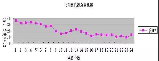 鑒于六七號(hào)磨機(jī)的狀況,我們對(duì)兩臺(tái)磨機(jī)停磨進(jìn)磨觀察,六號(hào)磨機(jī)內(nèi)兩倉(cāng)料球比過(guò)高,進(jìn)磨后看不到鋼球,物料高出一個(gè)鋼球的高度,正常情況下鋼球應(yīng)該高出料面露出半個(gè)鋼球?yàn)樽罴眩S現(xiàn)場(chǎng)測(cè)量計(jì)算六號(hào)磨一倉(cāng)填充率為28.7%二倉(cāng)為29.0%;七號(hào)磨機(jī)進(jìn)磨觀察一倉(cāng)鋼球露出料面一半,說(shuō)明填充率應(yīng)該是可以的,測(cè)量計(jì)算一倉(cāng)的填充率為31.2%二倉(cāng)為29.2%;這種磨機(jī)的最佳填充率一倉(cāng)為30%左右二倉(cāng)為31%左右。隨取七號(hào)磨樣做了磨機(jī)的篩余曲線,磨機(jī)均采用急停的停磨方式,入磨共取樣品24個(gè)做80um和200um的篩余。見(jiàn)圖1。