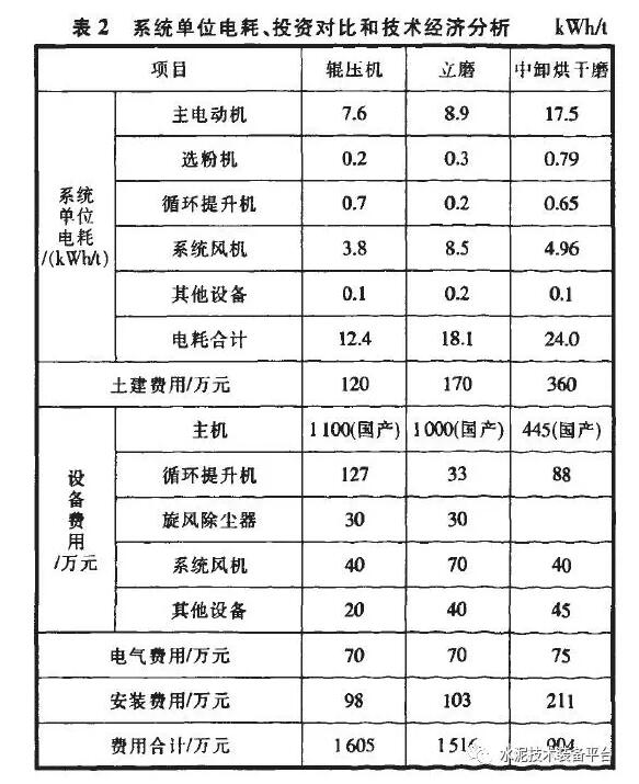 3種生料終粉磨系統(tǒng)主機(jī)設(shè)備對比見表1,單位電耗、投資及技術(shù)經(jīng)濟(jì)分析見表2。