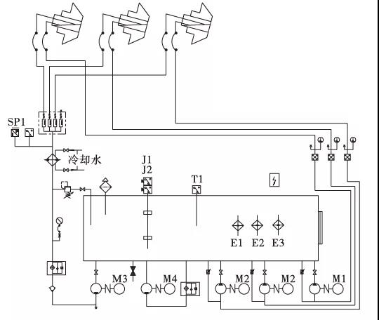 立磨潤滑系統(tǒng)原理如圖2所示,磨輥潤滑系統(tǒng)工作原理為:潤滑系統(tǒng)工作時,油液經(jīng)供油泵從油箱抽出,經(jīng)過濾器、冷卻器、分流器等進入磨輥內(nèi)部,經(jīng)循環(huán)潤滑換熱后,由回油泵從磨內(nèi)強制抽出,送回油箱,潤滑系統(tǒng)通過循環(huán)往復(fù)實現(xiàn)磨輥的潤滑功能。單個磨輥供油泵分配流量為13 L/min,單輥配置一個能力為20 L/min的回油泵強制回油。