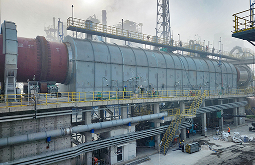 轉(zhuǎn)化焙燒:鋰輝石精礦從精礦庫(kù)人工送至斗式提升機(jī)提升至精礦倉(cāng),再經(jīng)圓盤(pán)給料機(jī)和螺旋給料機(jī)加入碳酸鋰回轉(zhuǎn)窯窯尾,利用窯尾預(yù)熱段高溫氣體干燥精礦,精礦在煅燒段約1200℃左右的溫度下進(jìn)行晶型轉(zhuǎn)化焙燒,由α型(單斜晶系,密度3150kg/m3)轉(zhuǎn)化為β型鋰輝石(四方晶系,密度2400kg/m3,即焙料),轉(zhuǎn)化率約98%。